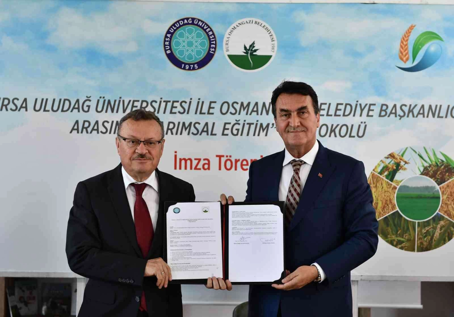 Ata tohumlarının üretilmesine, geliştirilmesine ve yetiştirilmesine büyük katkı sağlayacak olan ‘Tarımsal Eğitim’ protokolü, Osmangazi Belediye Başkanı Mustafa Dündar ve Uludağ Üniversitesi Rektörü Prof. Dr. Ahmet Saim Kılavuz arasında Ekolojik Yaşam Merkezi’nde imzalandı. Tohumda dışa bağımlılığa son verip, yerli ve milli tohumu yaygınlaştırmak için çalışmalar yürüttüklerini ifade eden Başkan Dündar, “Uludağ Üniversitesi ile birçok alanda işbirliği yaparak kente değer katacak çalışmalar gerçekleştiriyoruz. Son dönemde tüm dünyada tarımsal üretim konusunda krizlerin yaşandığını görüyoruz. Dünya hızla globalleşirken, yaşanan gıda krizlerinden sonra yerlileşme ve millileşme konusu ön plana çıktı. Ülkeler özellikle gıda üretimde kendi kendine yetebilmek adına ciddi çalışmalar yürütüyor. Bizler de bu doğrultuda Ekolojik Yaşam Merkezi’nde ata tohumundan fideler üreterek yaygınlaşmasına, ülke tarımının geleceğine katkı koyacak çalışmalar yürütüyoruz. Tarımsal alanda yerli ve milli tohumun yaygınlaştırılmasını sağlıyoruz” dedi.