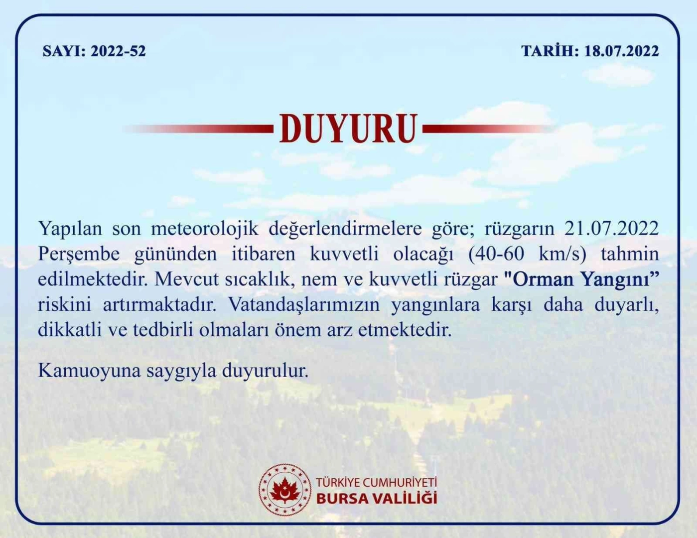 Valilikten yapılan açıklamada, "Yapılan son meteorolojik değerlendirmelere göre rüzgarın 21.07.2022 Perşembe gününden itibaren kuvvetli olacağı (40-60 km/s) tahmin edilmektedir. Mevcut sıcaklık, nem ve kuvvetli rüzgar orman yangını riskini artırmaktadır. Vatandaşlarımızın yangınlara karşı daha duyarlı, dikkatli ve tedbirli olmaları önem arz etmektedir" denildi.