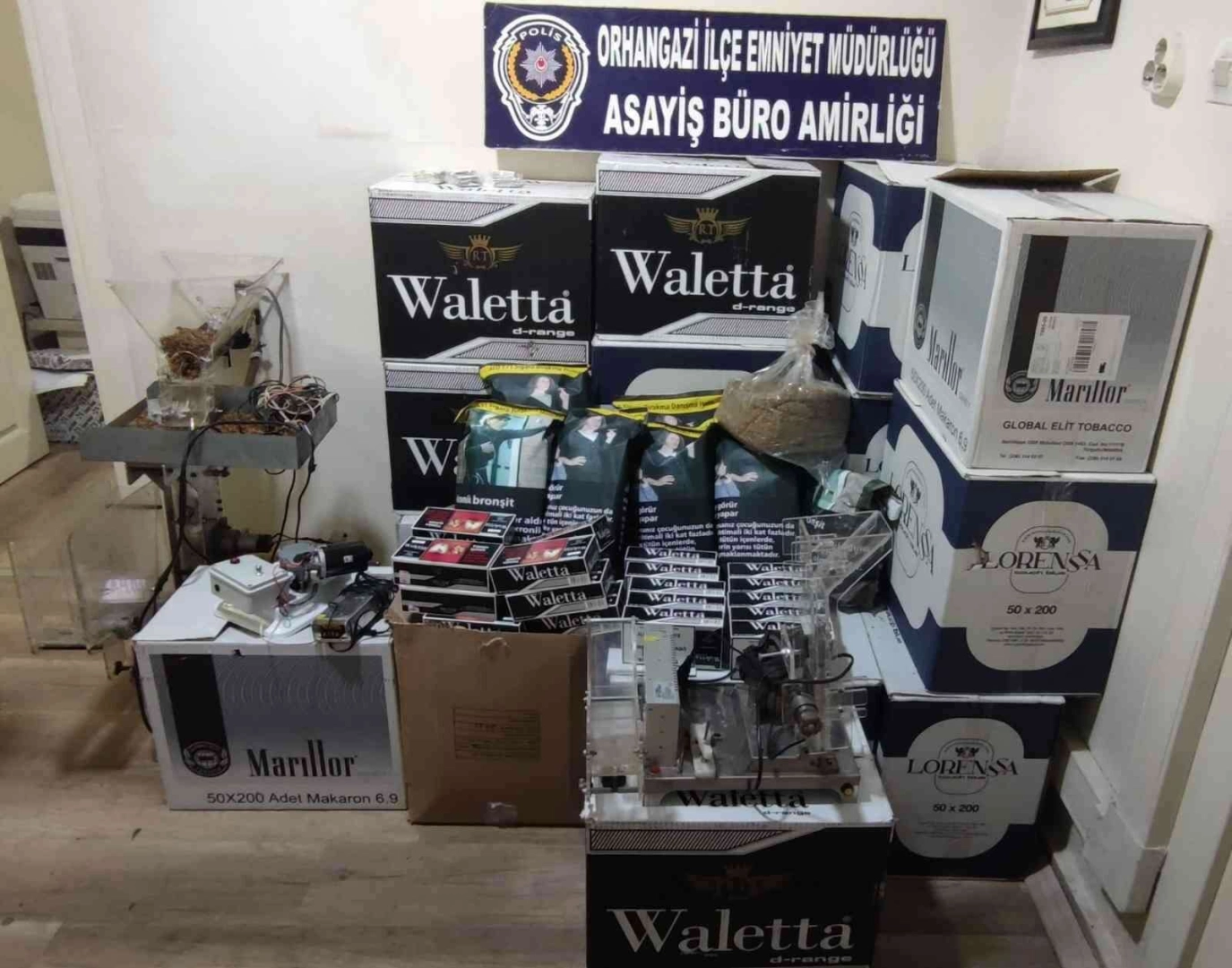 Orhangazi İlçe Emniyet Müdürlüğü Asayiş Büro Amirliği ekipleri, ihbar üzerine tütün kaçakçılığının önlenmesi ve suça karışan kişinin yakalanması amacıyla çalışma başlattı. Polis ekiplerince adım adım takip edilen B.D.’nin (50) tütün sakladığı öğrenildi. Cumhuriyet Savcısının talimatı ile B.D.’nin kiraladığı depoya operasyon yapan Orhangazi polisi, 1 adet büyük sigara doldurma makinesi, 1 adet küçük sigara doldurma makinesi, 19 adet ağzı açılmış 1 kilogramlık kıyılmış tütün, 50 adet 200’lük doldurulmuş makaron kutu, 622 adet 200’lük boş makaron kutu, 100 adet içerisi boşaltılmış tütün paketi ve 150 adet TABDK bandrolü ele geçirdi. Polis ekiplerince depodaki malzemelere el koyulurken, şüpheli şahıs ise ifadesi alınmak üzere gözaltına alındı.