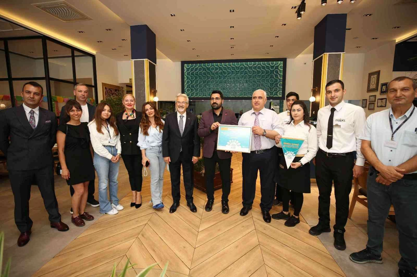 Yaklaşık 4 bin gıda işletmesi olan Nilüfer ilçesinde Nilüfer Belediyesi’nin, özellikle hijyen konusunda standartlar üzeri hizmet veren iş yerlerinin bilinirliğini artırmak ve bu konuda farkındalık oluşturmak üzere tescillediği örnek iş yerleri ağına bir yenisi daha eklendi. Nilüfer Belediye Başkanı Turgay Erdem, denetimler sonucu belge alamaya hak kazanan bir restoranı ziyaret ederek işletme sahibi Şükrü Zeren’e örnek iş yeri belgesi ve flamasını teslim etti.