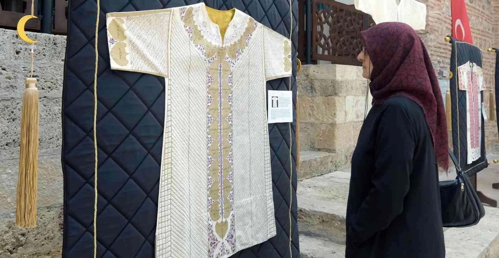 Tezhip sanatçısı Ayşe Vanlıoğlu ile Hattat Mehmet Vanlıoğlu, açılış töreninin ardından sergiyi gezen protokol üyelerine ‘eserlerin nasıl hazırlandığı ve gömleklerin üzerindeki yazı ve işaretlerin ne anlama geldiği hakkında’ bilgiler verdi.