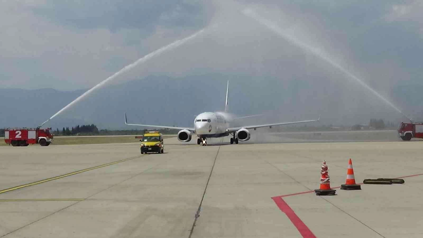 Almanya’nın Dusseldorf kentinden kalkan uçak saat 14.11’de Balıkesir Koca Seyit Havalimanı’na iniş yaptı. 181 yolcu ve 10 mürettebat taşıyan uçak havalimanı itfaiyesi tarafından su takı yapılarak karşılandı.