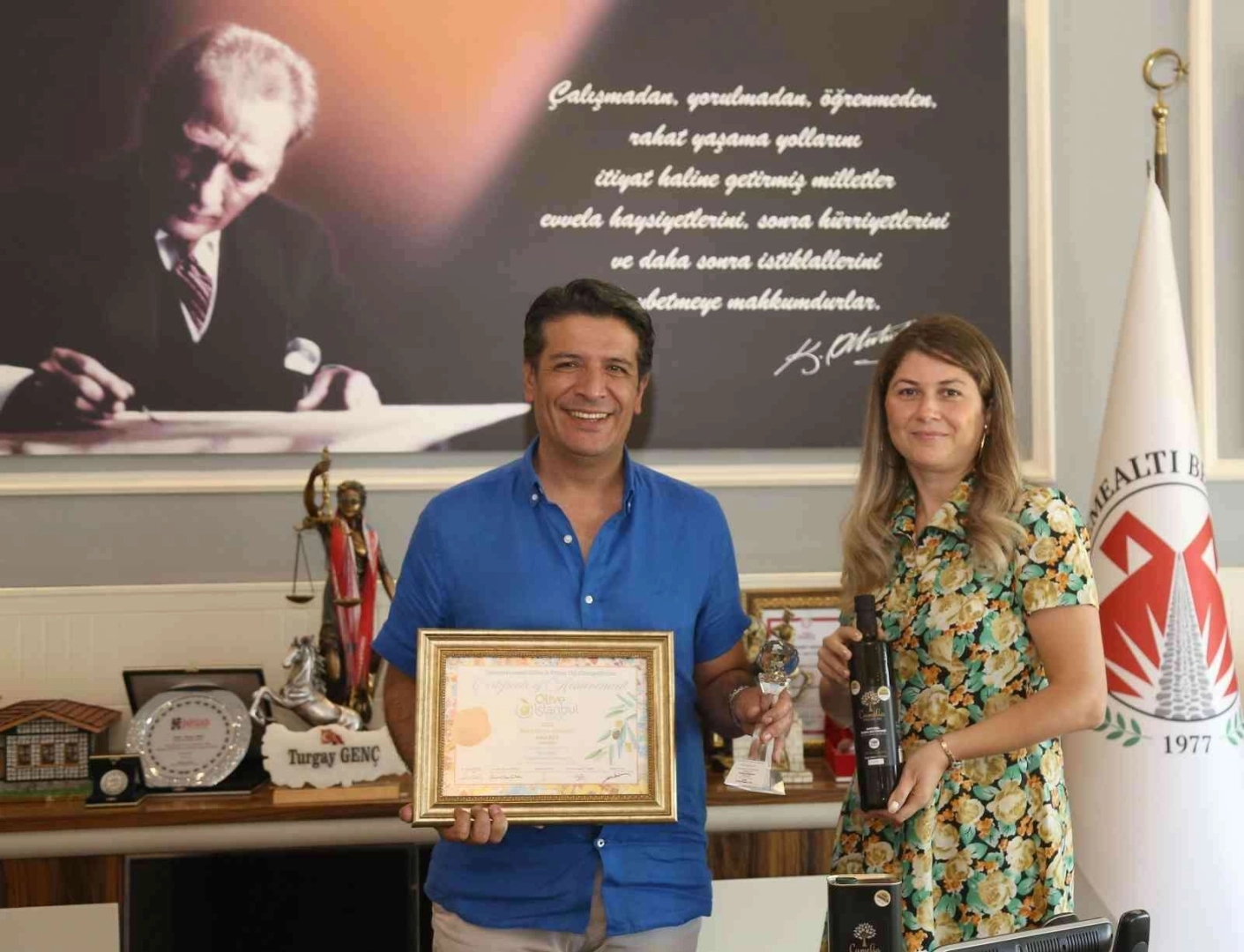 25 derecede soğuk sıkım 0.2 asit ve yüksek polifenollü zeytinyağı üretimi yapan ve dünya üçüncülüğüyle taçlanan Döşemealtı zeytininden üretilen Camelia Zeytinyağının üreticisi Kamile İlkuçan ve Erkan İlkuçan, Döşemealtı Belediye Başkanı Başkanı Turgay Genç’i ziyaret edip ödüllü zeytinyağından hediye etti.