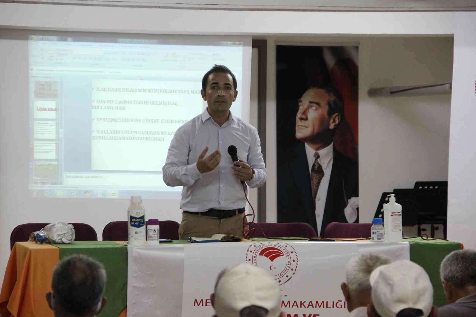Menderes İlçe Tarım ve Orman Müdürü Oktay Sezgin’in açılış konuşmaları sonrasında Menderes İlçe Tarım Müdürlüğü Ziraat Yüksek Mühendisi Belgin Doğan Aslan tarafından üreticilere bitki koruma ürünleri kullanımı konusunda eğitim gerçekleştirildi.