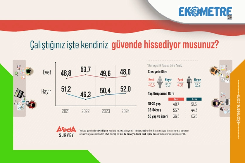Güvensizlik duygusunu en çok yaşayan yaş grubu ise yüzde 63,5 ile 55 yaş ve üzerindekilere ait. İkinci sırada ise yüzde 51,3 ile 18-34 yaş aralığındaki gençler yer alıyor. Gençler Kendilerini İş Yerinde Güvende Hissetmiyor Areda Survey’in Türkiye genelinde 4.048 kişinin katılımıyla gerçekleştirdiği araştırmaya göre, Türk halkının yüzde 52’si iş yerinde kendini güvende hissetmediğini, yüzde 48’i ise güvende hissettiğini belirtiyor. Son dört yılın verilerine bakıldığında, iş yerinde kendini güvende hissettiğini söyleyenlerin oranı 2021 yılında yüzde 48,8 iken 2022’de yüzde 53,7’ye yükseliyor. Ancak, sonraki iki yılda bu oran düşüş gösteriyor. 2023’te yüzde 49,6’ya gerileyen güven oranı, 2024’te yüzde 48’e kadar geriliyor. Demografik dağılımlara göre güven oranları da dikkat çekiyor. İş yerinde kendini güvende hissetmediğini belirtenler arasında en yüksek oran yüzde 63,5 ile 55 yaş ve üzeri yaş grubunda görülüyor. Bu yaş grubundakilerin yalnızca yüzde 36,5’i iş yerinde kendini güvende hissettiğini ifade ediyor. Araştırmanın dikkat çeken bir diğer verisi ise, 18-34 yaş aralığındaki gençlerin güvensizlik sıralamasında ikinci sırada yer alması. Gençlerin yüzde 51,3’ü çalıştığı iş yerinde kendini güvende hissetmediğini belirtirken, 35-54 yaş aralığındaki katılımcılar arasında bu oran değişiyor. Bu yaş grubundakilerin yüzde 55,7’si iş yerinde güvende hissettiğini ifade ederken, yüzde 44,3’ü güvensizlik hissettiğini dile getiriyor. Kadın ve erkek katılımcıların iş yerinde kendisini güvende hissetme durumları ise birbirine yakın oranlarda seyrediyor. Kadınların yüzde 51,7’si ve erkeklerin yüzde 52,2’si iş yerinde kendisini güvende hissetmediğini ifade ediyor. Öte yandan, güvende hissettiğini belirten kadınların oranı yüzde 48,3, erkeklerin oranı ise yüzde 47,8 olarak ölçülüyor. Araştırmanın Metodolojisi Türkiye genelinde 4.048 kişinin katıldığı ve 30 Aralık 2024 - 01 Ocak 2025 tarihleri arasında yapılan araştırma, kantitatif araştırma yöntemlerinden CAWI tekniği ile “Areda Survey’in Profil Bazlı Dijital Paneli” kullanılarak gerçekleştirildi.