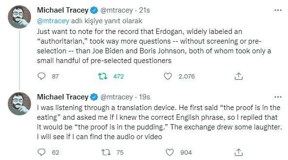 Tracey paylaşımında, “İster inanın ister inanmayın, Erdoğan az önce bana söz hakkı verdi ve sorumu yanıtladı. ABD/İngiltere’nin askeri gerilimin tırmanmasına yönelik çağrı yaparken, kendisinin Ukrayna’da diplomasi çağrısı yapan az sayıdaki veya tek NATO lideri olduğunu belirttim. O (Erdoğan) da bana ‘her yiğidin bir yoğurt yiyişi vardır’ yaklaşımının etkili olduğunu söyledi. Yaygın şekilde ’otoriter’ olarak etiketlenen Erdoğan’a eleme olmaksızın, her ikisi de önceden seçilmiş soruları alan Joe Biden ve Boris Johnson’dan çok daha fazla soru sorulduğunu belirtmek istiyorum” ifadelerini kullandı.