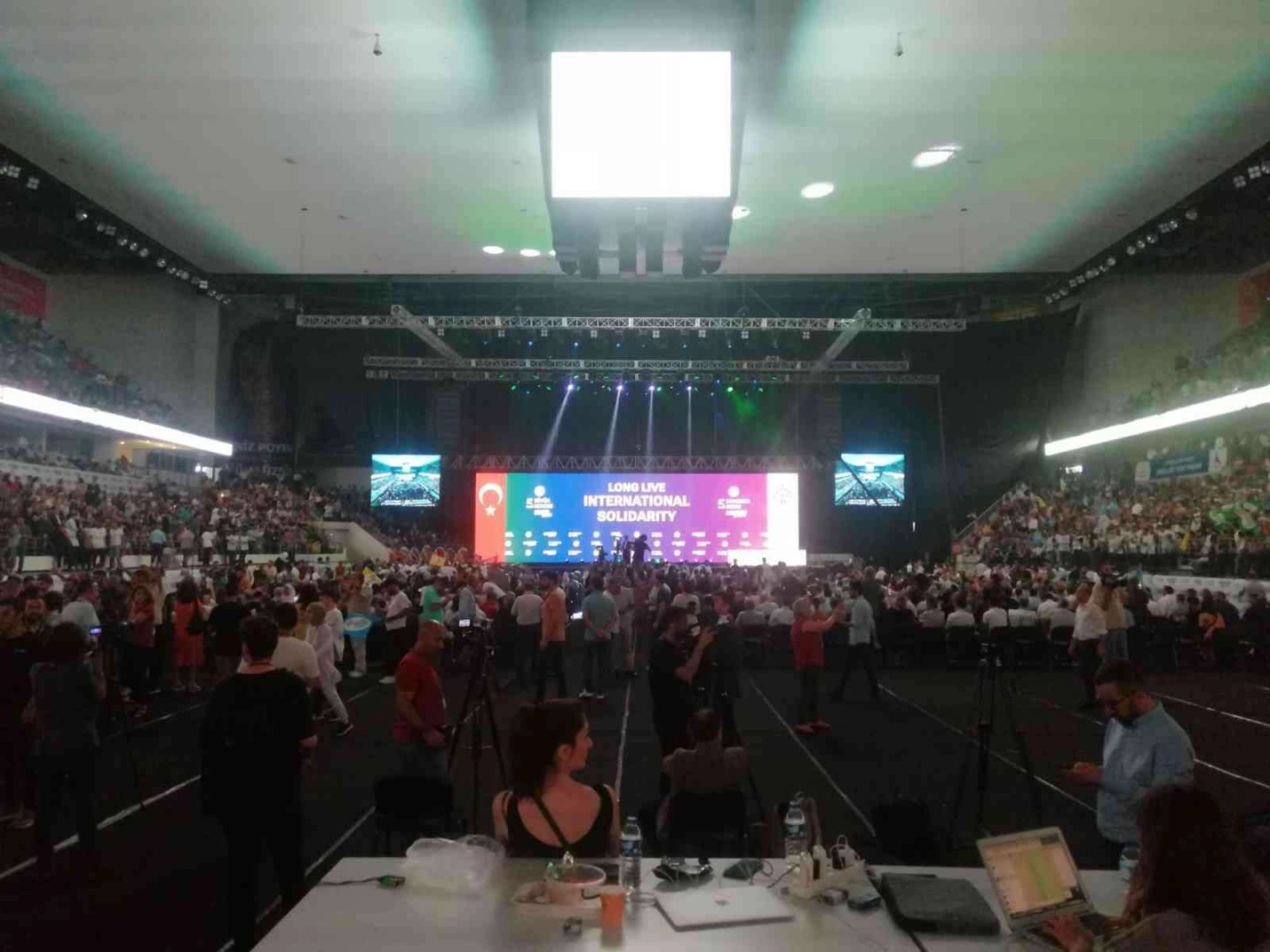 Ankara Spor Salonu’nda gerçekleşen HDP 5’inci Olağan Kongresi, Saruhan Oruç’un divan başkanı seçilmesi ile başladı. Divan Kurulu’nun yaptığı Türkçe ve Kürtçe konuşmaların ardından saygı duruşunda bulunulurken, İstiklal Marşı okunmadı. Kongreye eski HDP Milletvekili Sırrı Süreyya Önder, eski Demokratik Toplum Partisi (DTP) Genel Başkanı Ahmet Türk ve tutuklu Selahattin Demirtaş’ın eşi Başak Demirtaş da katıldı. HDP Eş Başkanı Pervin Buldan kürsüde konuşma yaptığı esnada ise yüzlerini gizleyen iki kişi sahnenin önüne doğru hamle yaparak terörist başı Abdullah Öcalan’ın posterini açmaya çalıştı. Alanda yer alan görevlilerce şahıslara müdahale edilirken, yüzü bezle kapalı şahıslar posteri eline alarak tribünlere doğru koşarak uzaklaştı. Öte yandan salonda bulunan bir grup da terörist başı Abdullah Öcalan’ın lehine slogan attı.