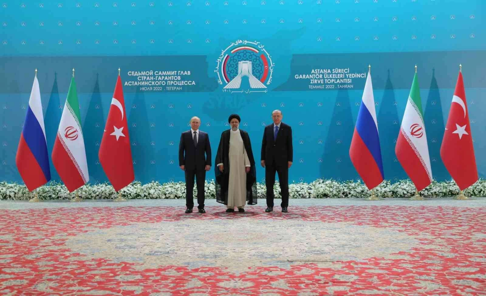 Rusya Devlet Başkanı Vladimir Putin, İran Cumhurbaşkanı İbrahim Reisi ve Cumhurbaşkanı Recep Tayyip Erdoğan ile İran’ın başkenti Tahran’daki Türkiye-Rusya-İran Üçlü Zirvesi’nin basına açık kısmında gerçekleştirdiği konuşmasında, “Öncelikle ben İran Cumhurbaşkanına teşekkür ederim. Çünkü Astana sürecindeki 7. Zirve ve yüz yüze görüşme bizim için önemliydi. Bu görüşmede Suriye’de yaşanan sorunları da gözden geçirdik. Genel olarak baktığımızda Türkiye, Rusya ve İran’ın, Suriye çalışmaları önemlidir. Bizim tarafımızdan bakıldığında ise sivillere karşı kullanılan güç azaldı. Astana Zirvesi, Suriye’de tamamen çözüm bulana kadar devam etmeli. Ayrıca bizim prensiplerimiz var. Bağımsızlık, Suriye için çok önemli ve çalışmalarımızı bu yönde sürdürmekte bizim için önemlidir. Üçlü görüşmelerin ilerlemesi de önem arz ediyor” dedi.