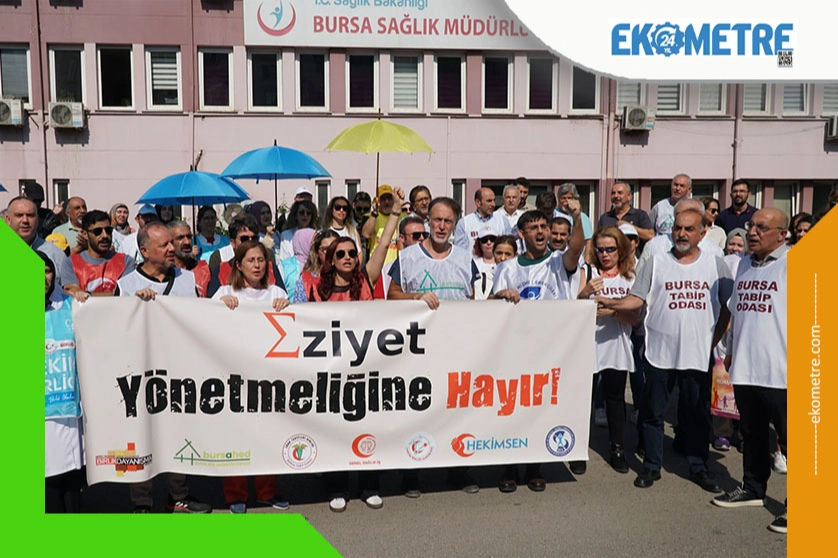 Bursa Tabip Odası (BTO), Genel Sağlık İş Sendikası, HEKİM SEN, Hekimler Birliği Sendikası, Sağlık ve Sosyal Hizmetler Emekçileri Sendikası Bursa Şubesi (SES), Bursa Aile Hekimleri Derneği (BURSAHED) ile Birlik ve Dayanışma Derneği’nin çağrısıyla gerçekleşen ortak basın açıklamasında ‘Eziyet Yönetmeliğine Hayır!’ denildi.