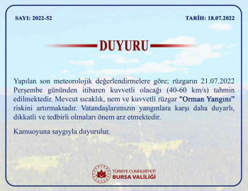 Valilikten yapılan açıklamada, "Yapılan son meteorolojik değerlendirmelere göre rüzgarın 21.07.2022 Perşembe gününden itibaren kuvvetli olacağı (40-60 km/s) tahmin edilmektedir. Mevcut sıcaklık, nem ve kuvvetli rüzgar orman yangını riskini artırmaktadır. Vatandaşlarımızın yangınlara karşı daha duyarlı, dikkatli ve tedbirli olmaları önem arz etmektedir" denildi.