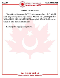 Bursa Valiliğinden yapılan açıklamada, "Dikey Geçiş Sınavına (DGS) katılacak adayların, T.C. kimlik kartı başvuru işlemleri için ilimiz Nilüfer ve Osmangazi İlçe Nüfus Müdürlükleri 03/07/2022 Pazar günü 07:00-11:00 saatleri arasında açık bulundurulacaktır. Kamuoyuna saygıyla duyurulur." ifadelerine yer verildi.
