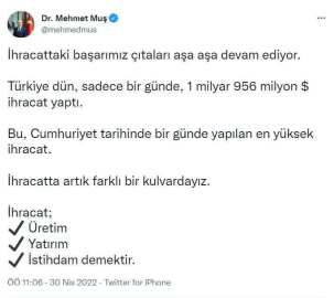Ticaret Bakanı Mehmet Muş, sosyal paylaşım sitesi Twitter hesabından yaptığı paylaşımla Türkiye’nin dün, sadece bir günde 1 milyar 956 milyon dolar ihracat yaptığını açıkladı. Bakan Muş, paylaşımında, “İhracattaki başarımız çıtaları aşa aşa devam ediyor. Türkiye dün, sadece bir günde, 1 milyar 956 milyon dolar ihracat yaptı. Bu, Cumhuriyet tarihinde bir günde yapılan en yüksek ihracat. İhracatta artık farklı bir kulvardayız. İhracat; üretim, yatırım, istihdam demektir” ifadelerine yer verdi.