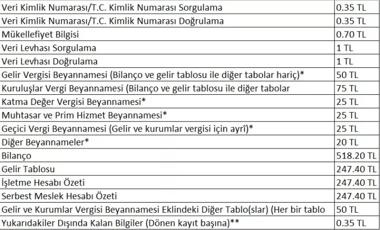 Yapılacak sorgularda, vergi kimlik numarası doğrulama hizmeti, vergi kimlik numarası sorgulama hizmeti, T.C. kimlik numarası doğrulama hizmeti, T.C. kimlik numarası sorgulama hizmeti ve vergi levhası doğrulama hizmetlerinden ücret alınacak.