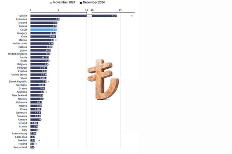 Türkiye, Aralık 2024’te yüzde 44,4 enflasyon oranıyla OECD ülkeleri arasında yine açık ara en yüksek seviyede yer aldı