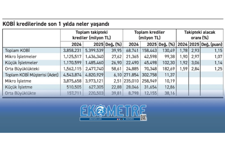 Toplam KOBİ kredilerinde takipteki alacak miktarı artışı yüzde 130,5 olurken bu TL cinsi kredilerde yüzde 131,9, yabancı para cinsi kredilerde ise yüzde 79,93 artış olarak yansıdı. Mikro işletmelerde takipteki alacak miktarında toplam artış yüzde 99,4 ile ikiye katlandı, mikro işletmelerin TL kredilerinde takipteki alacak yüzde 99,4, yabancı para kredilerde ise yüzde 03,16 büyüdü. Küçük işletmelerde de son bir yılda takipteki alacak artışı iki katını aşan bir yükseliş yaşadı.