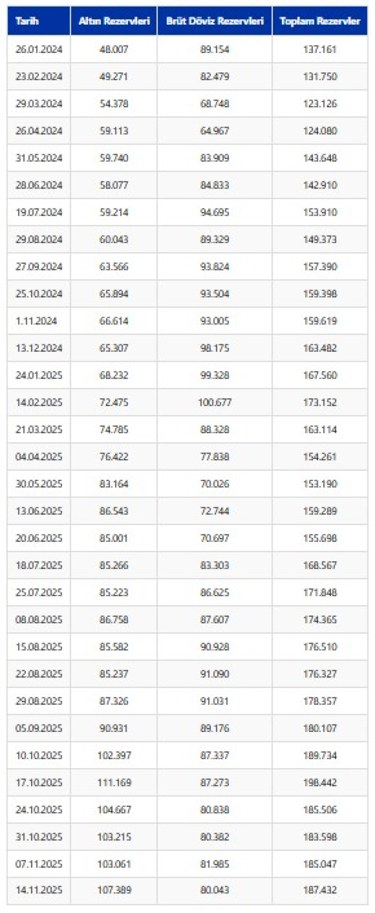 Türkiye Cumhuriyet Merkez Bankasının (TCMB) toplam rezervleri, 14 Kasım haftasında bir önceki haftaya göre 2 milyar 385 milyon dolar artarak 187 milyar 432 milyon dolara yükseldi