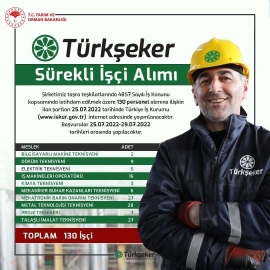 Türkşeker, taşra teşkilatında istihdam edilmek üzere 130 sürekli işçi alınacağını sosyal medya hesabından duyurdu. Açıklamada, şu ifadelere yer verildi: