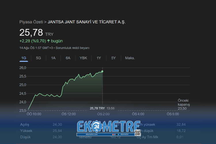 Borsada işlem gören jant üreticisi Jantsa, son iki günde hızlı bir değer artışı yaşadı. 13 Ağustos’ta 22,32 TL civarında işlem gören hisse fiyatı, 48 saat içinde 25,48 TL bandına yükseldi. Dün ralliye başlayan hissede bugün yükseliş oranı günün ilk yarısı itibarıyla yüzde 8'in üzerinde.