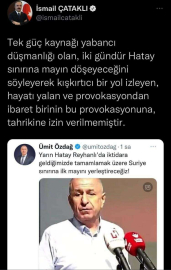 İçişleri Bakanlığı Sözcüsü Çataklı, sosyal medyadan yaptığı paylaşımda, “Tek güç kaynağı yabancı düşmanlığı olan, iki gündür Hatay sınırına mayın döşeyeceğini söyleyerek kışkırtıcı bir yol izleyen, hayatı yalan ve provokasyondan ibaret birinin provokasyonuna, tahrikine izin verilmemiştir” ifadelerine yer verdi.